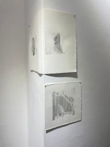 La mostra è articolata secondo un concept minimal, ma allo stesso tempo molto particolare ed intimo. Al centro della stanza c’è un’istallazione rappresentata proprio dal libro d’ artista, fluttuante, e appeso tramite un filo invisibile ad altezza visitatore e intorno, alle pareti, appesi tramite dei chiodi ma proiettati verso chi li osserva, e dunque non ben adesi al muro, si trovano i singoli fogli esplosi da “Senza memoria, senza sentimento”.
