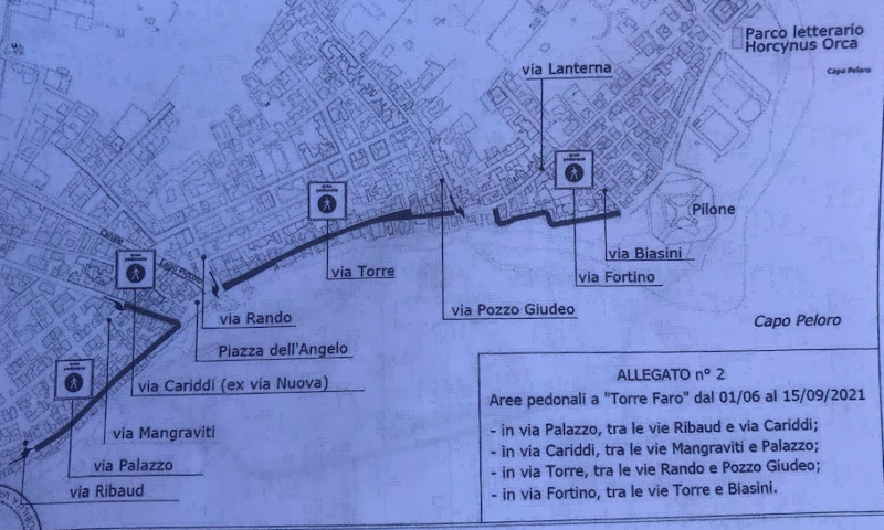 Tra il primo giugno ed il 15 settembre, Torre Faro dovrebbe essere pedonalizzata, in modo continuo (24 ore al giorno), festivi e feriali, nei tratti di via Palazzo tra le vie Pietro Ribaud e via Cariddi, nella via Cariddi (ex via Nuova) tra le via Mangraviti e Palazzo, il tratto di via Torre compreso tra le vie Rando e Pozzo Giudeo, e la via Fortino tra le vie Lanterna e Biasini. La pedonalizzazione sarebbe accompagnata dal servizio di bus navetta con partenza e arrivo al parcheggio delle torri Morandi, che percorrerà via Pozzo Giudeo, via Lanterna, via Fortino e via Senatore Arena con biglietto integrato di parcheggio e bus da 2 euro e 50 al giorno.