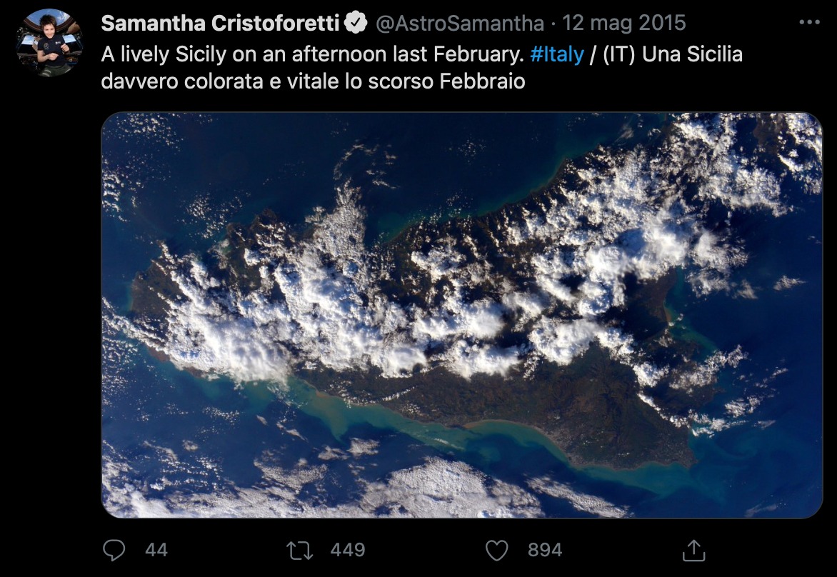 Nel 2015 durante i 199 giorni, 16 ore e 42 minuti nello spazio per la missione Futura 42, Cristoforetti, prima astronauta italiana nello spazio ha twittato anche alcune foto della Sicilia vista dalla stazione spaziale. Con la missione Cristoforetti ha conseguito il record europeo e il record femminile di permanenza nello spazio in un singolo volo (superato nel 2017)