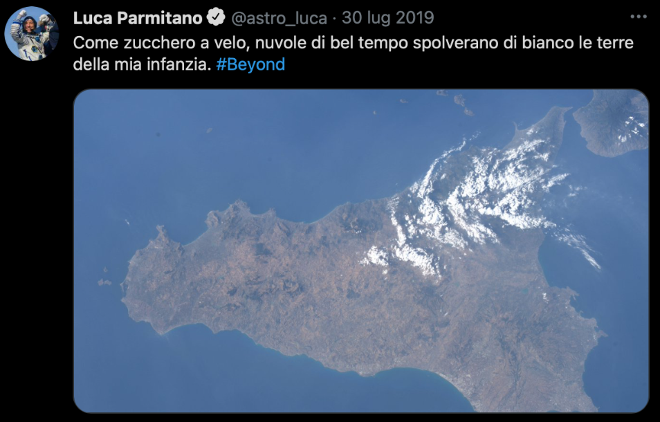 Durante la Expedition 61 (la 61° missione di lunga durata verso la stazione spaziale internazionale) iniziata il 3 ottobre 2019, Luca Parmitano in veste di primo astronauta italiano e terzo europeo a comandare la ISS ha pubblicato una serie di tweet della Sicilia dall’alto.