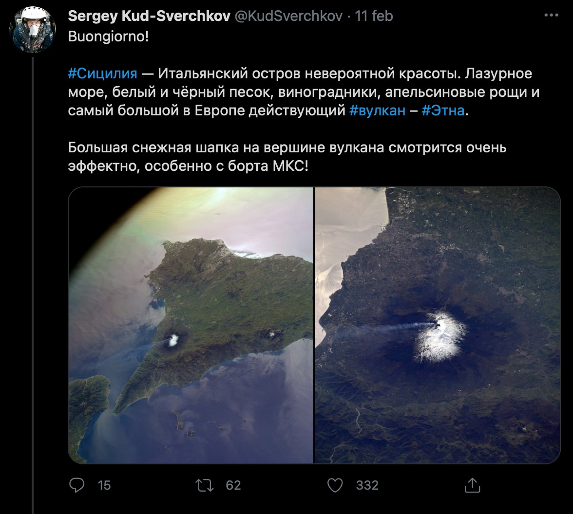 Durante la missione Expedition 64, iniziata lo scorso 21 ottobre 2020 (e durata fino ad aprile 2021) il cosmonauta russo Sergey Kud-Sverchkov ha scattato delle foto alla Sicilia e allo Stretto di Messina commentandone la bellezza e ponendo l’attenzione sull’ Etna, in piena attività in quei giorni. “Un’ isola italiana di incredibile bellezza. Mare azzurro, sabbia bianca e nera, vigneti, aranceti e il vulcano attivo più grande d’Europa, l’Etna. La grande calotta di neve in cima al vulcano sembra molto impressionante, soprattutto dalla ISS!”