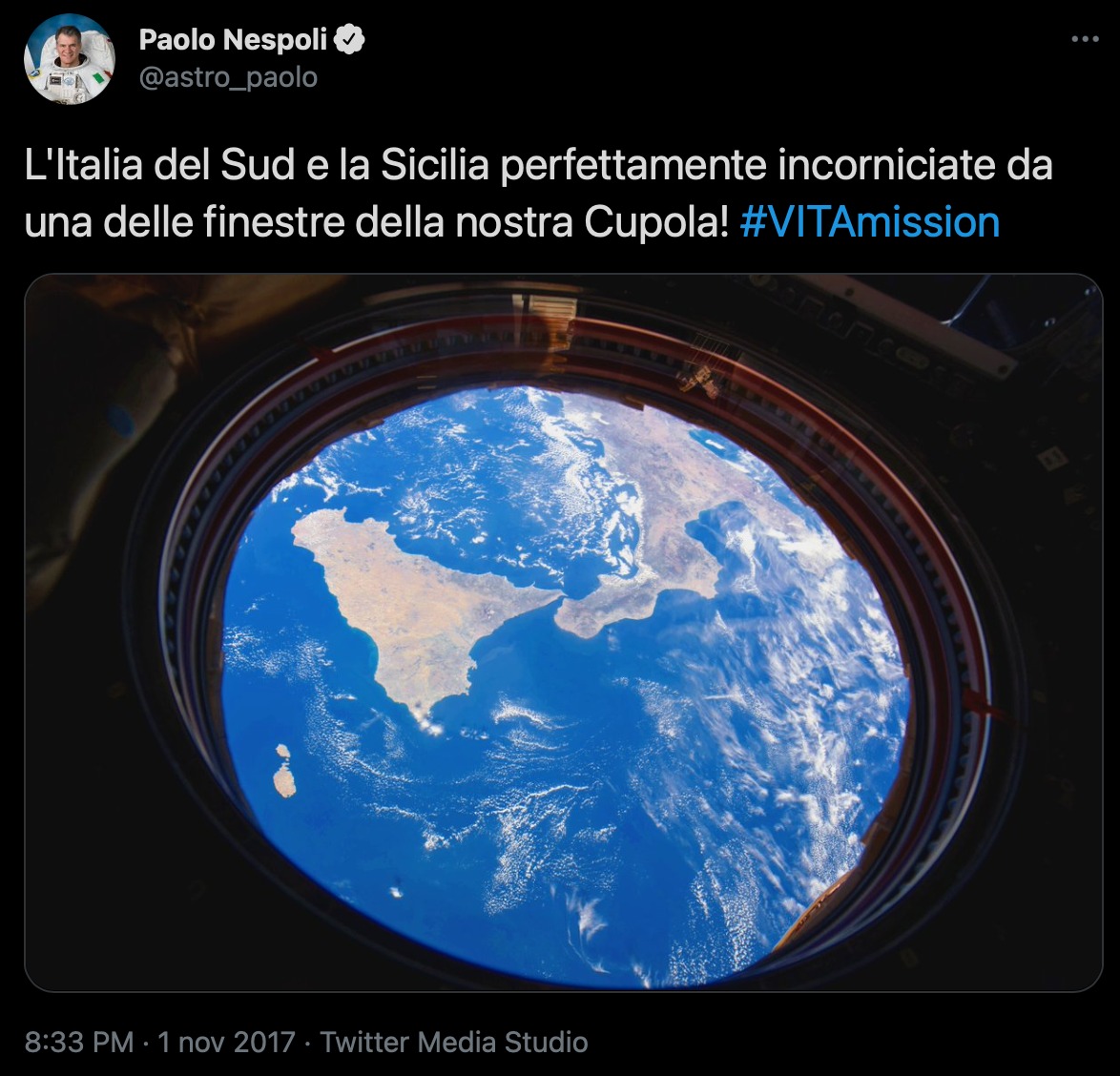 Durante la sua terza missione nello spazio (Expedition 52) cominciata a luglio 2017 e finita a settembre dello stesso anno, Nespoli ha twittato una foto del sud Italia incorniciato dalla finestra della “cupola”, il punto della stazione spaziale in cui gli astronauti possono fermarsi a riposare.