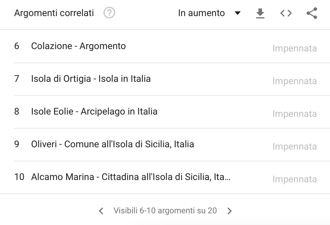 La situazione resta invariata con la chiave di ricerca “vacanza in Sicilia”, che vede al primo posto tra le ricerche correlate, proprio Messina, seguita da chiavi più generiche. Anche in questo caso tutte registrano ancora un’impennata di ricerche (fattore positivo visto l’avvicinarsi della stagione estiva).