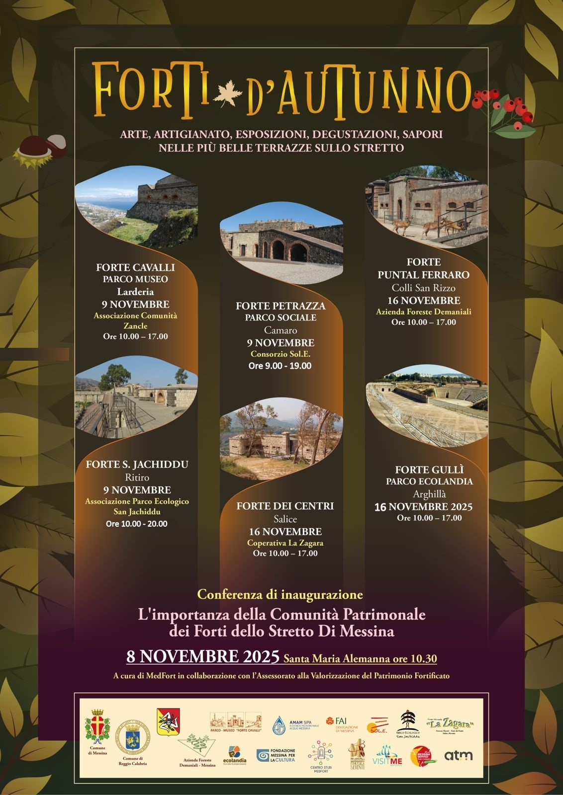 MESSINA. Domenica 9 e domenica 16 novembre si svolgerà a Messina la seconda edizione della kermesse “Forti d’Autunno“, promossa dall’Amministrazione comunale, in collaborazione con il Centro Studi MEDFORT, l’Azienda Foreste Demaniali di Messina, custode del Forte Puntal Ferraro, e le Associazioni referenti dei Forti Petrazza, Cavalli, San Jachiddu, Serra la Croce e Monte dei Centri.