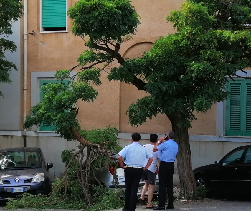 Il crollo è avvenuto intorno a metà mattinata, quando con un forte rumore, arbusti, tronchi e grossi pezzi di corteccia si sono staccati da un albero, cadendo sulla vettura sottostante, che ha subito lo schiacciamento del tettuccio e altri danni. Sul posto una pattuglia della polizia municipale che ha proceduto a constatare i danni e stilare il verbale.