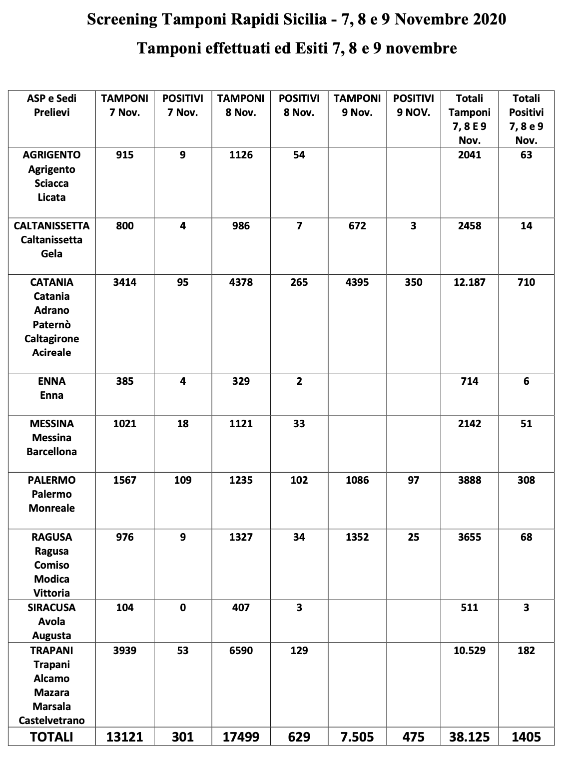 MESSINA. Terminato il weekend di screening che ha visto partecipare più di 38mila persone su tutto il territorio siciliano tra sabato 7 e lunedì 9, sono stati comunicati gli esiti dei test su base volontaria, che variano rispetto a quelli comunicati ieri dalla Regione Siciliana (in considerazione dei 7505 tamponi rapidi eseguiti ieri nei territori di Caltanissetta, Catania, Palermo e Ragusa).