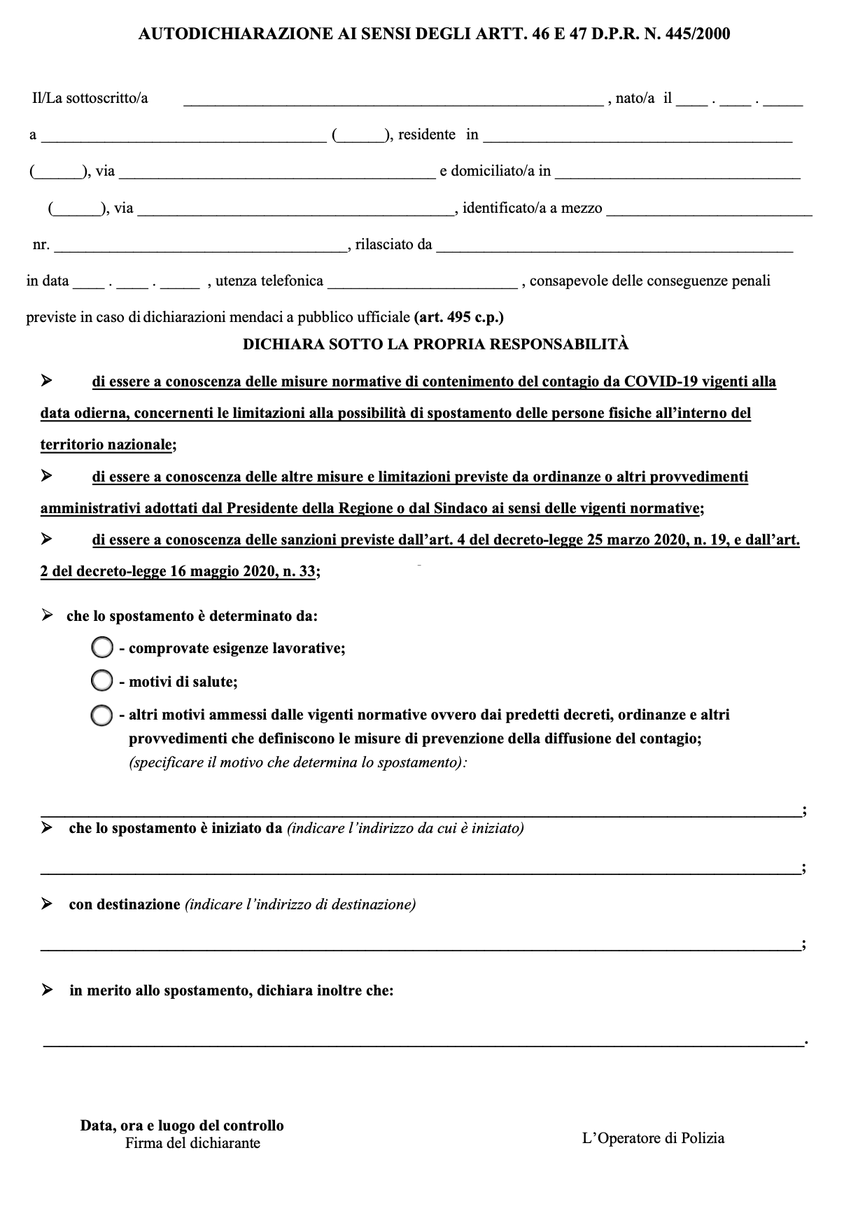 Gli spostamenti verso altri Comuni invece sono consentiti esclusivamente per comprovate esigenze lavorative, situazioni di necessità o motivi di salute che devono essere descritti nel modello standard di autocertificazione (che avranno a disposizione anche le pattuglie delle forze dell’ordine).